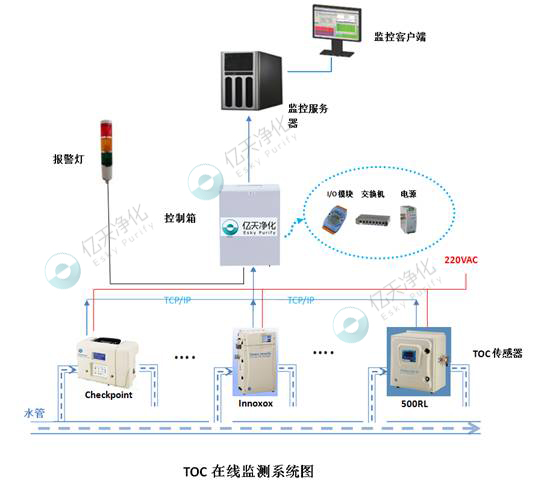 系統主要是由TOC傳感器、電控箱、服務器及監測軟件組成。通過CheckPoint TOC傳感器采集數據,電控系統傳輸數據,監控服務器負責保存處理數據,達到數據實時在線監測目的,還可以提供各種輔助功能,如:TOC歷史數據查詢、圖表生成、操作記錄、報警預警等,幫助用戶及時發現問題、分析問題、解決問題。